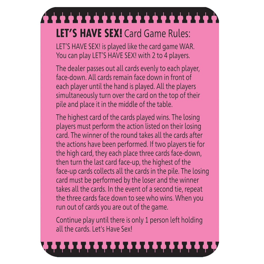 Let’s Have Sex is a game of sexual adventure. Battle your opponent by flipping over your cards to see who has the highest-ranking card. When you win, you can perform your choice of action on the cards played. Who will have the most satisfying sex? As a prelude, try playing the Let’s Get Naked card game for extra sexy fun.