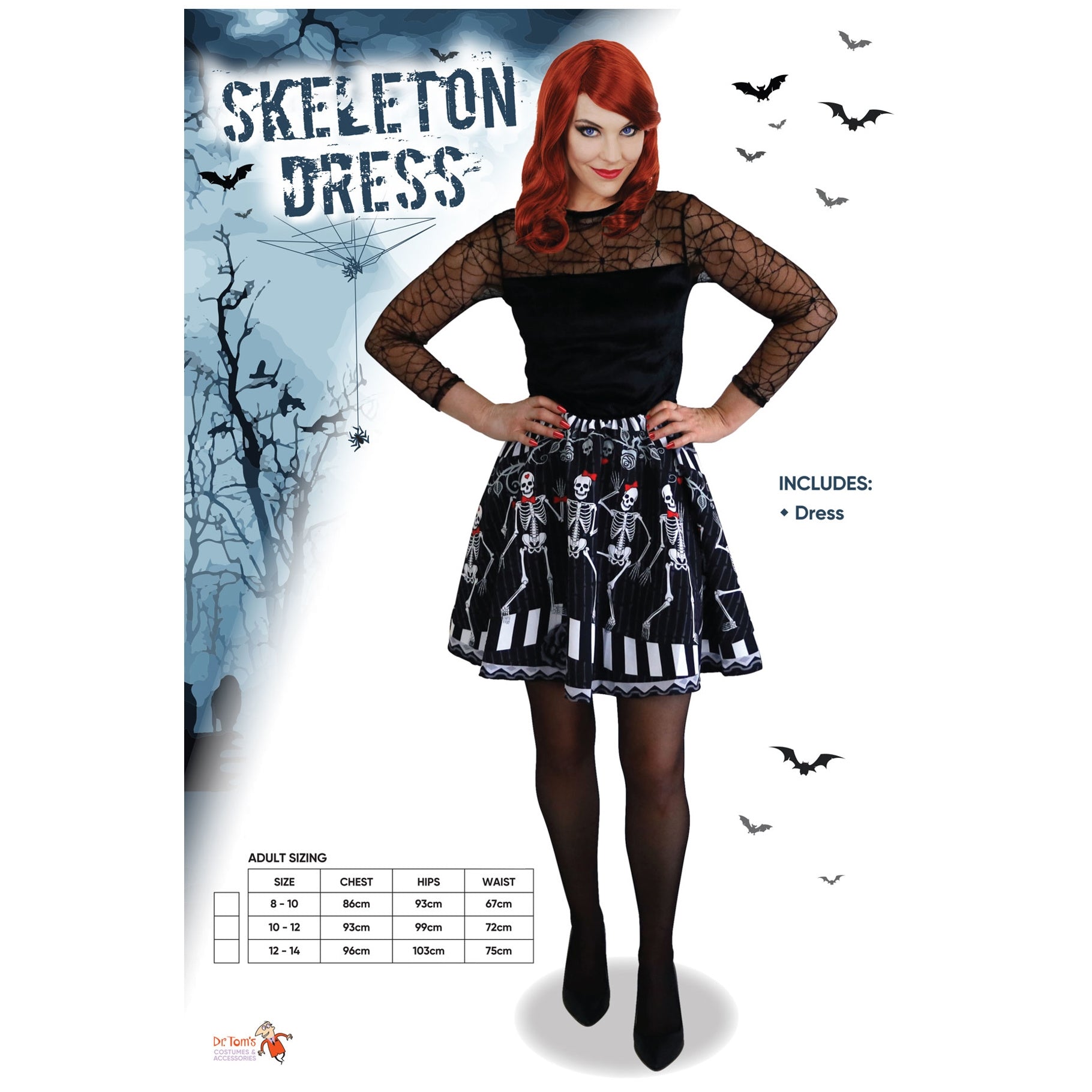 Halloween costume - black velveteen bodice with spider web mesh long sleeves. Attached skirt with dancing skeleton print.