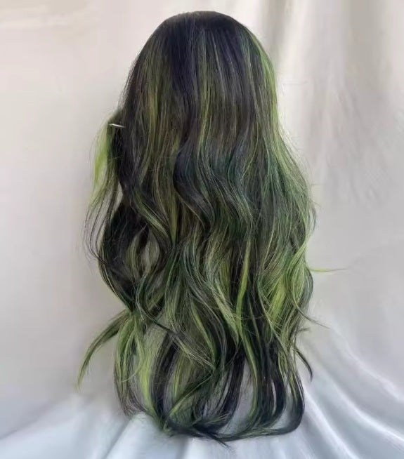 Wig Black Ombre Green Layered Long Wavy 26"+
