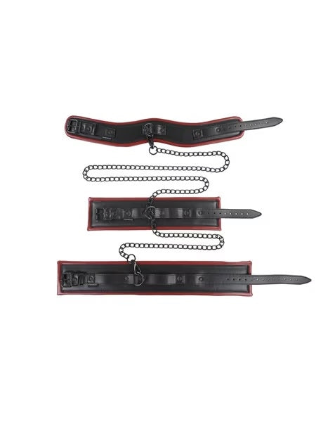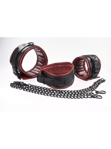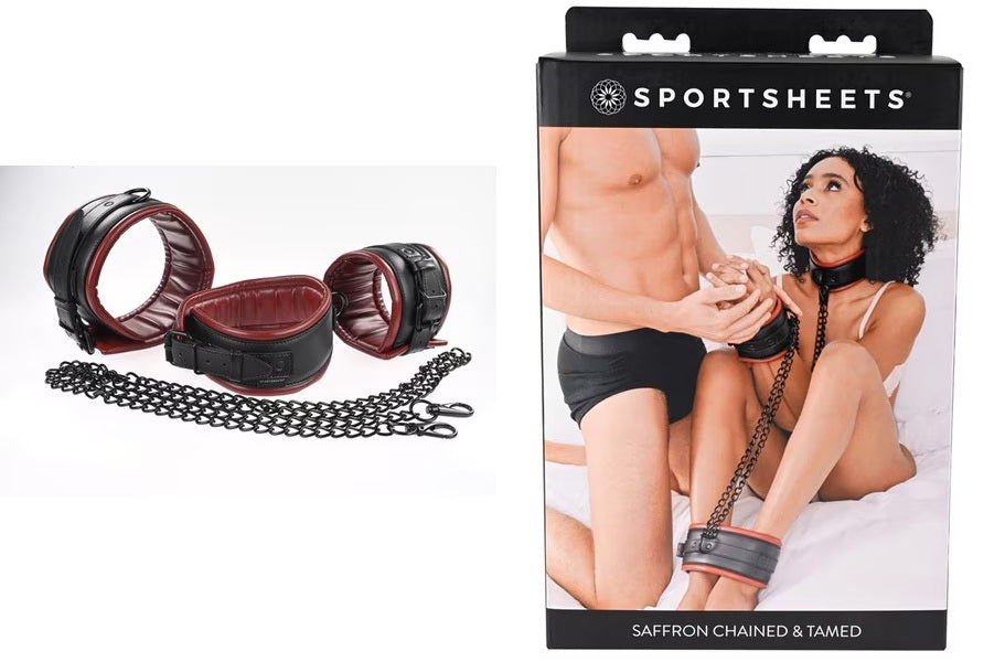 Enhance your next scene with the Saffron Chained & Tamed, expertly designed to keep your partner at your mercy. Use all the pieces together or interchangeably for optimum positioning. Begin your next session with the posture collar for added control. Then add the double wrist cuffs to lock their hands together and the double ankle cuffs to keep them in place. Next, connect the cuffs and collars how you see fit and exude your power over them.