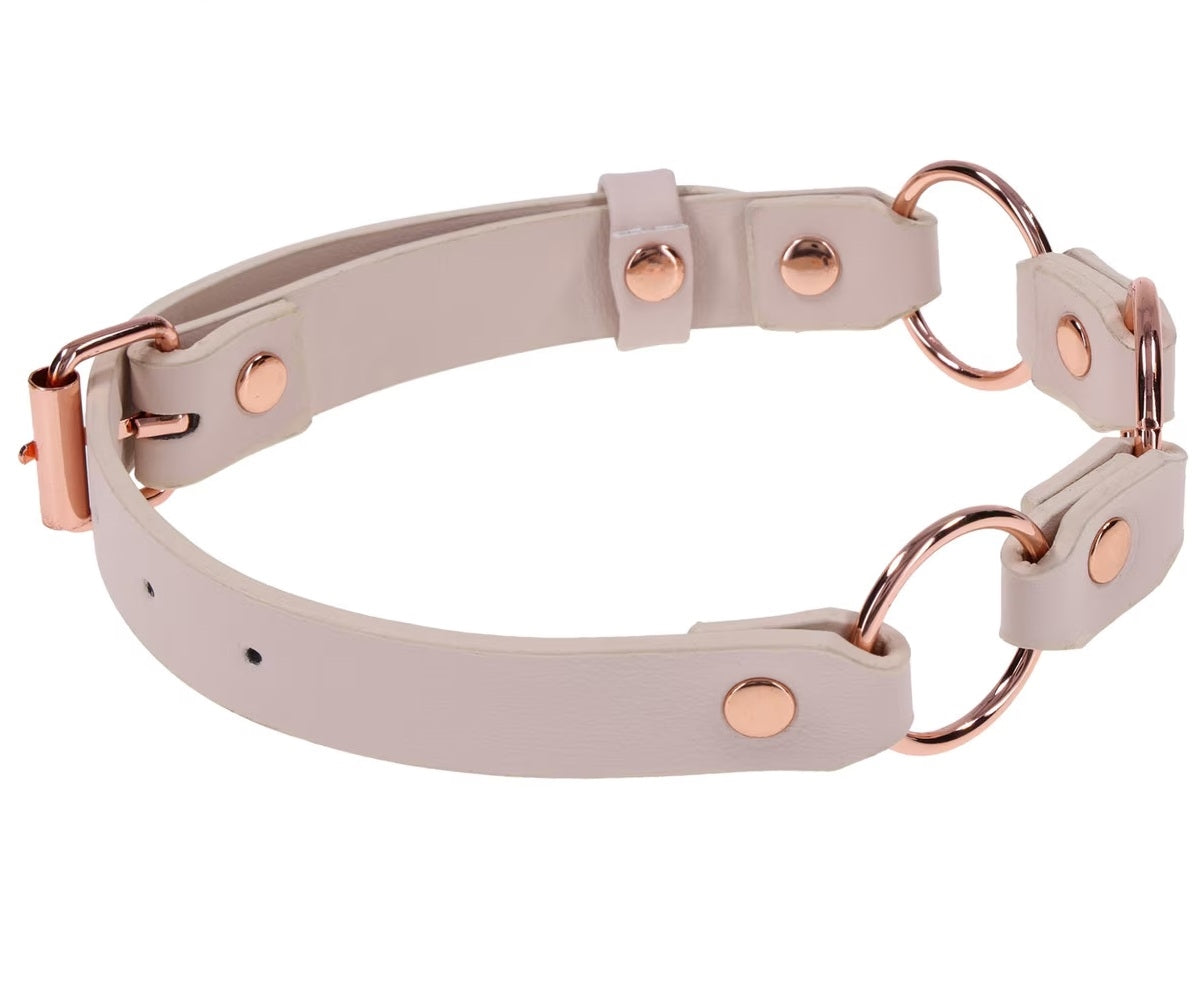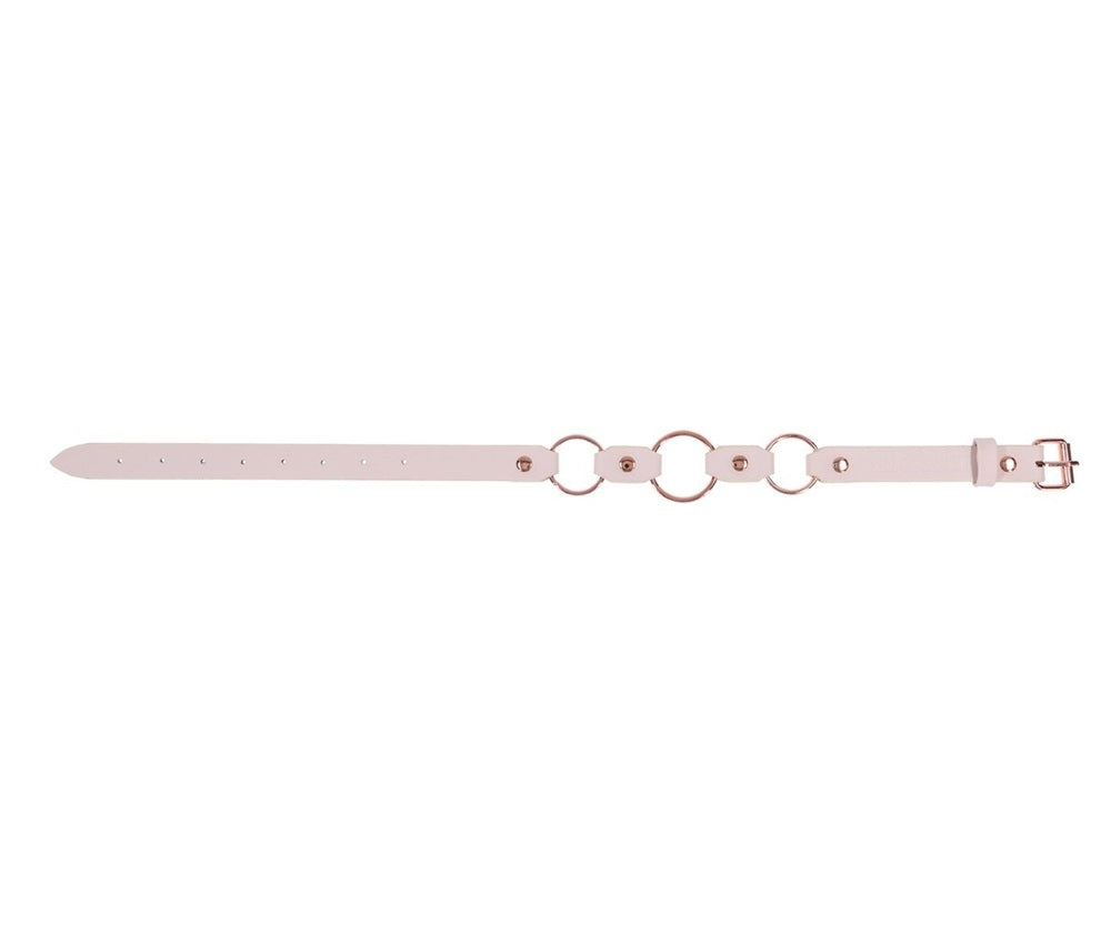 Stay decked in only the finest luxury BDSM wear with the Peaches 'N CreaMe Ring Day Collar. Stylish and seductive, this bold accessory turns heads and sparks curiosity, hinting at your kink to those in the know. Crafted from smooth, comfortable faux leather, it features three rose gold rings that gleam with every move. Pair it with your favourite leash, a teasing set of clamps, or wear it solo to show you're ripe for the taking.