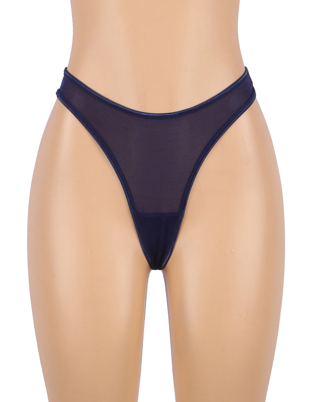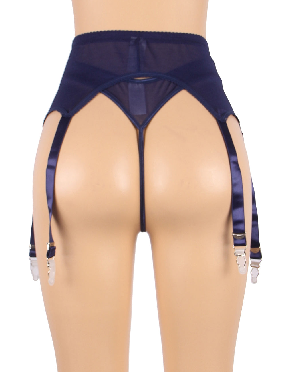 Sexy and fashionable mesh and lace trim garter and g-string set.