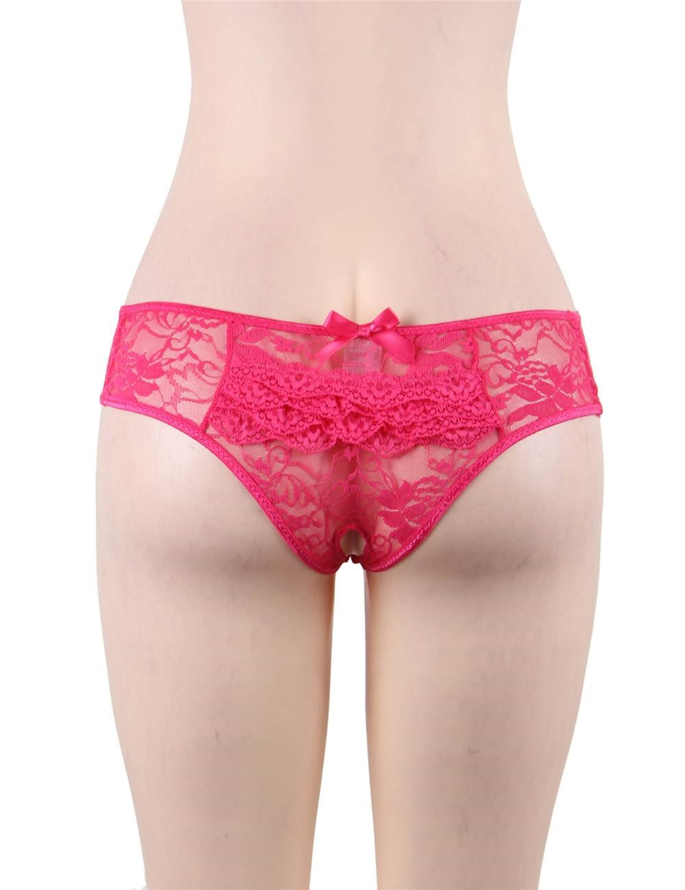 These crotchless panties feature layered lace details and a silk bow at the back for a cute and playful touch. Elastic lining along the panties provide a secure and comfortable fit during wear.