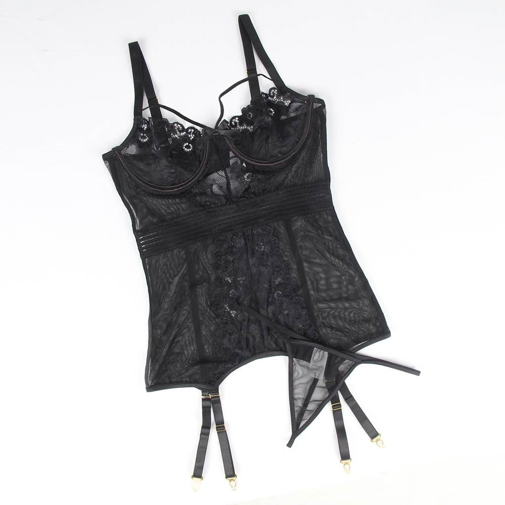 Sexy black mesh and lace babydoll with suspenders and underwire.