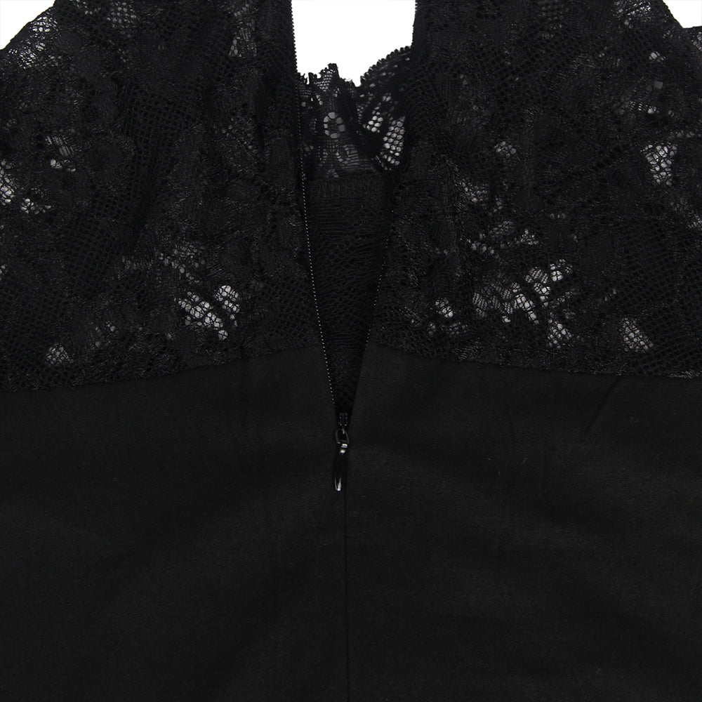 One-piece sleeveless, black fashion bodysuit with lace upper and snap crotch