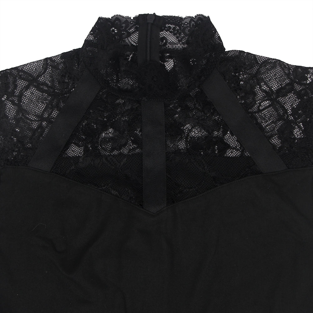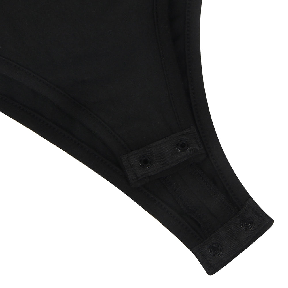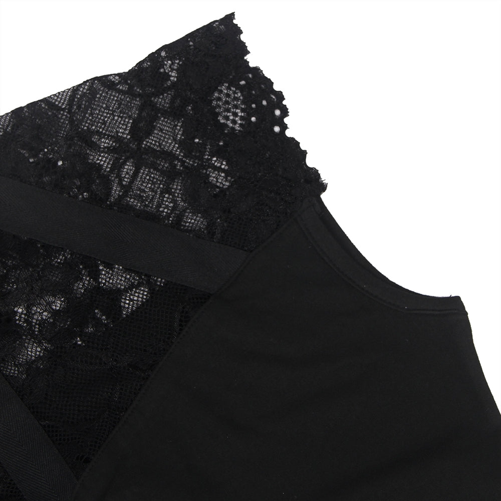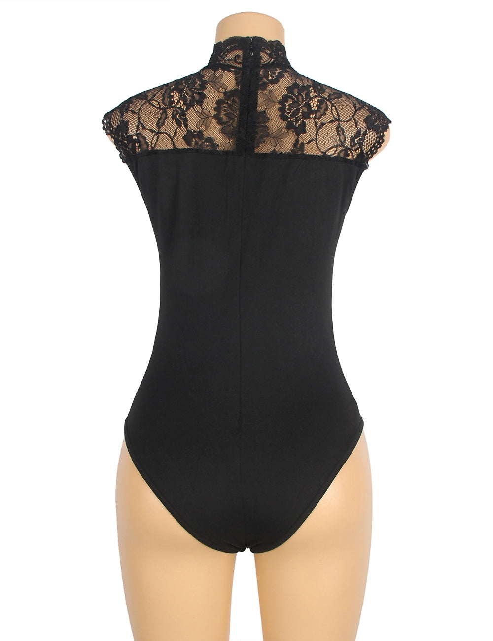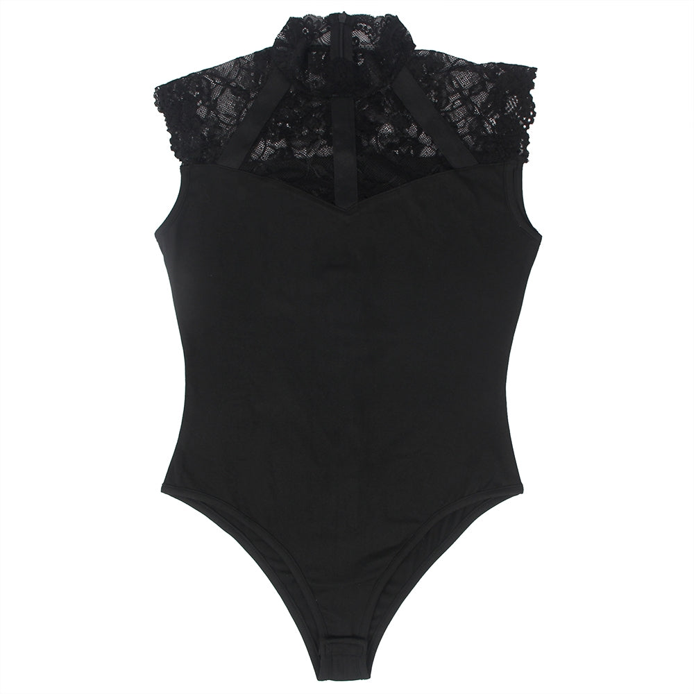One-piece sleeveless, black fashion bodysuit with lace upper and snap crotch