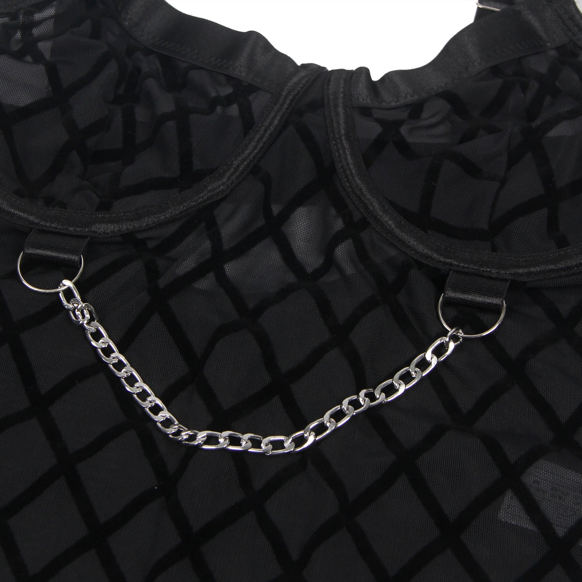 This classic bodysuit with a modern twist features gold chain accents, mesh material with velvet detailing and a detachable garter belt. A true statement piece whether worn alone or paired with a favourite pair of jeans.