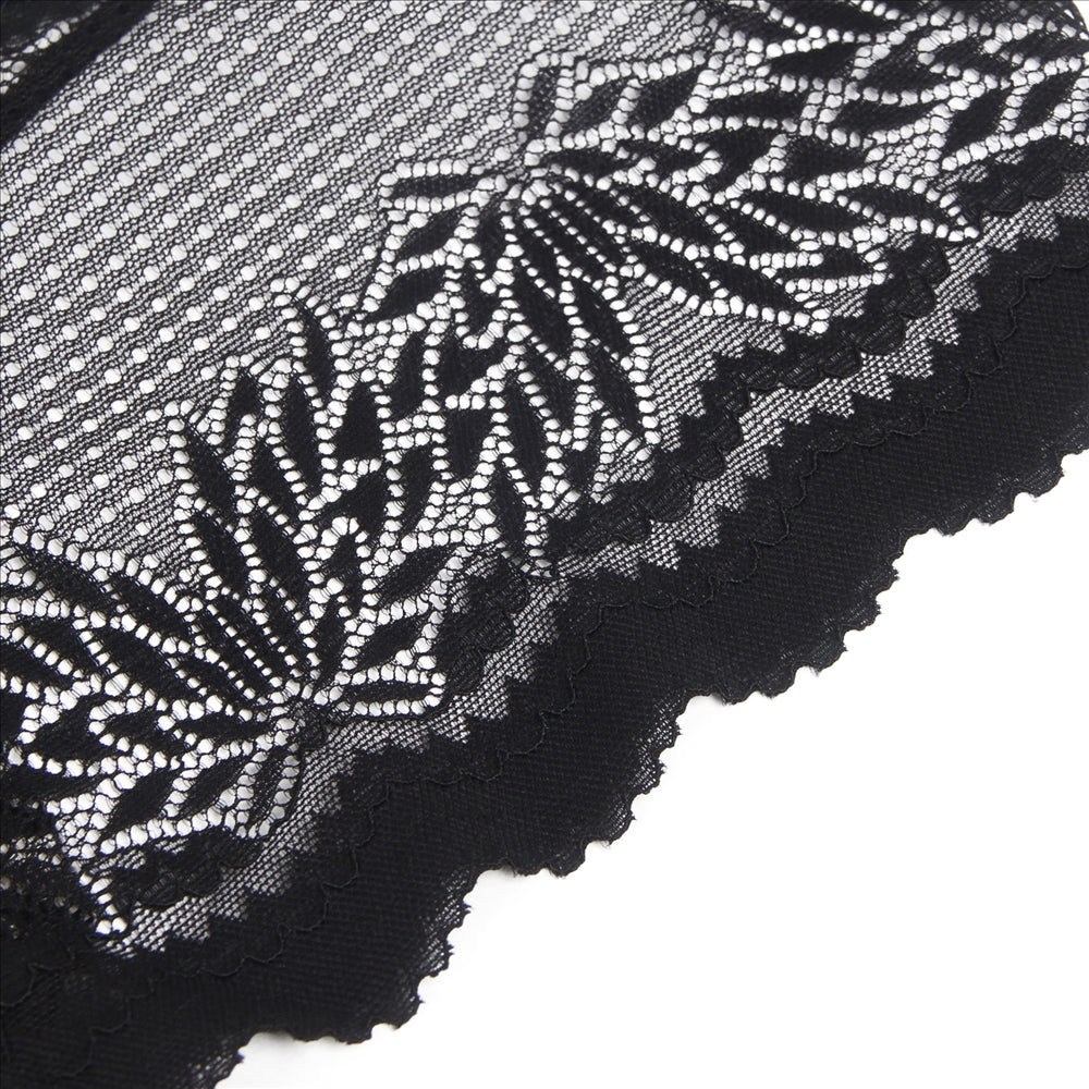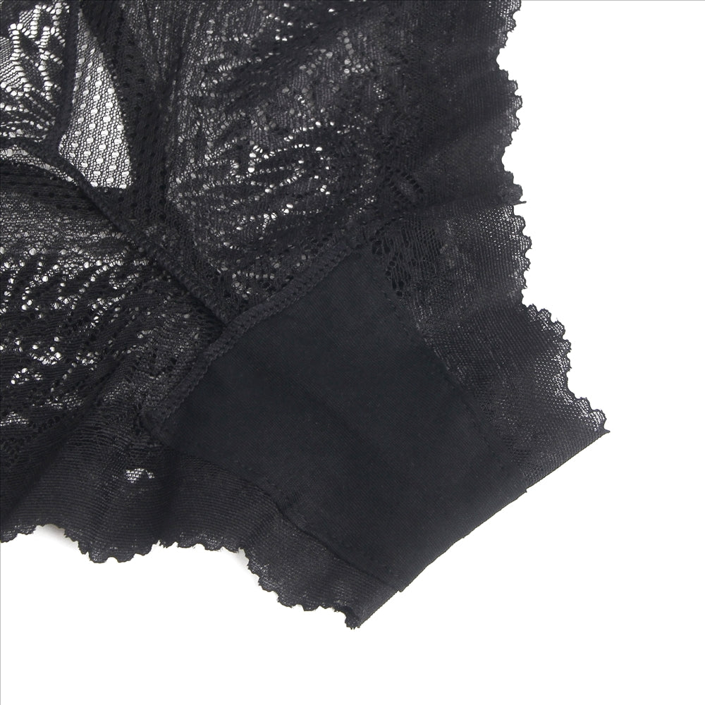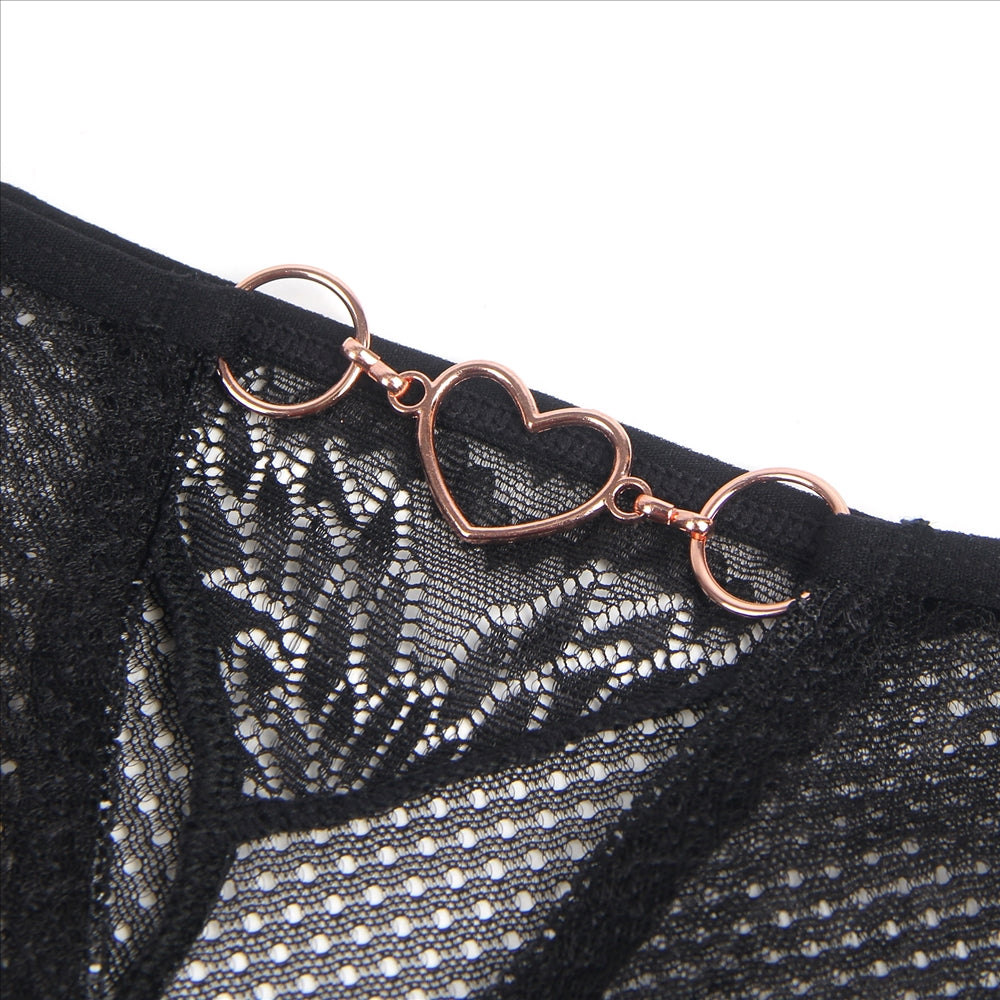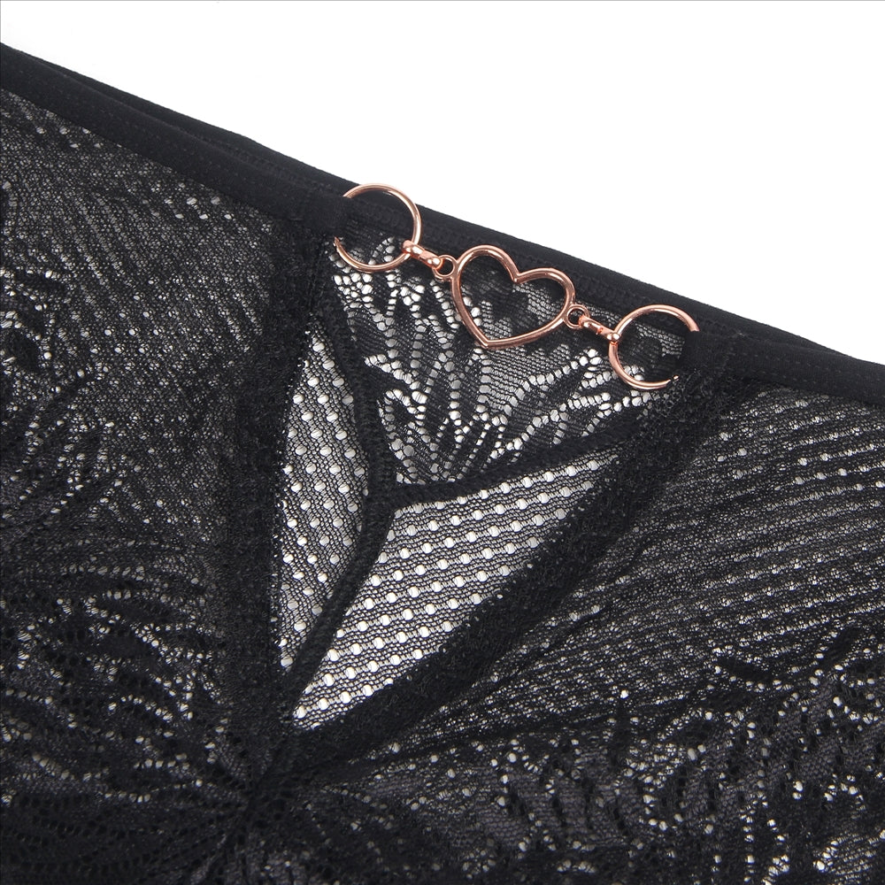 Black sexy lace panty with decorative metal heart and hollow back design.