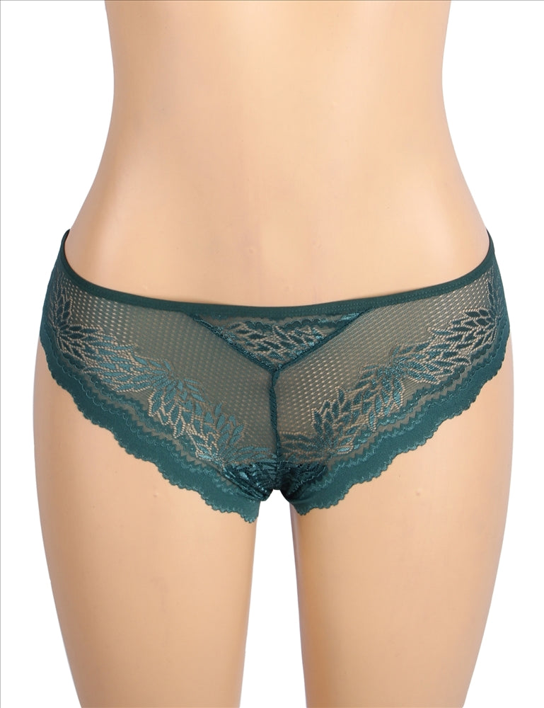 Green sexy lace panty with decorative metal heart and hollow back design.