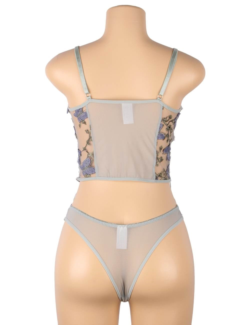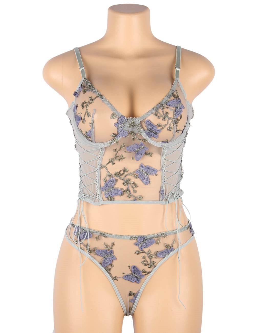 Butterfly Pattern Embroidery Mesh Lingerie Set With Underwire