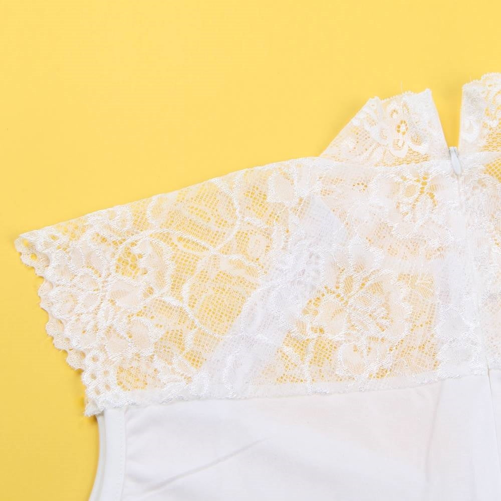 One-piece sleeveless, white fashion bodysuit with lace upper and snap crotch